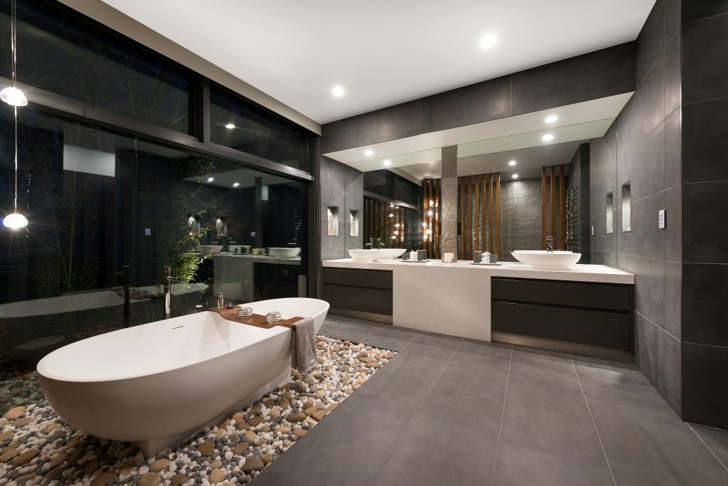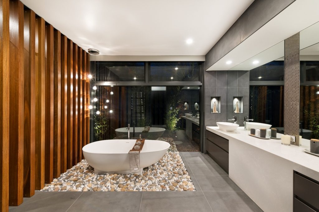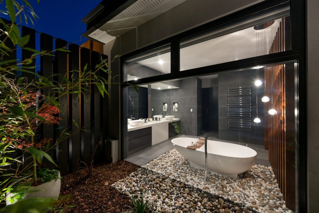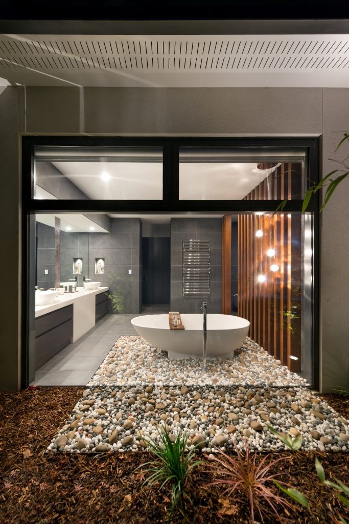 A private courtyard screens the ensuite from passers-by allowing the user to fully enjoy the view out of the expansive large glass windows. Stones on the floor carry through to the exterior connecting the home to the outside in a unique and stunning way. A timber screen, in the same form as the external cladding expertly conceals the wash closet and shower while further connecting the interior and exterior.